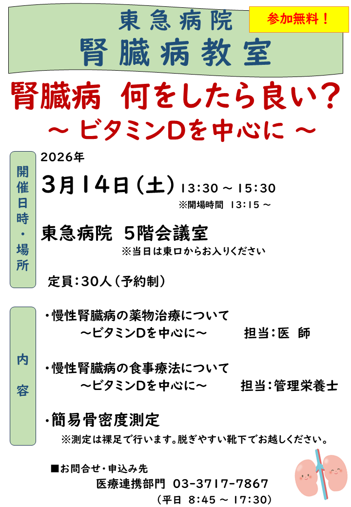 腎臓病教室開催のお知らせ【2026/3/14(土)】